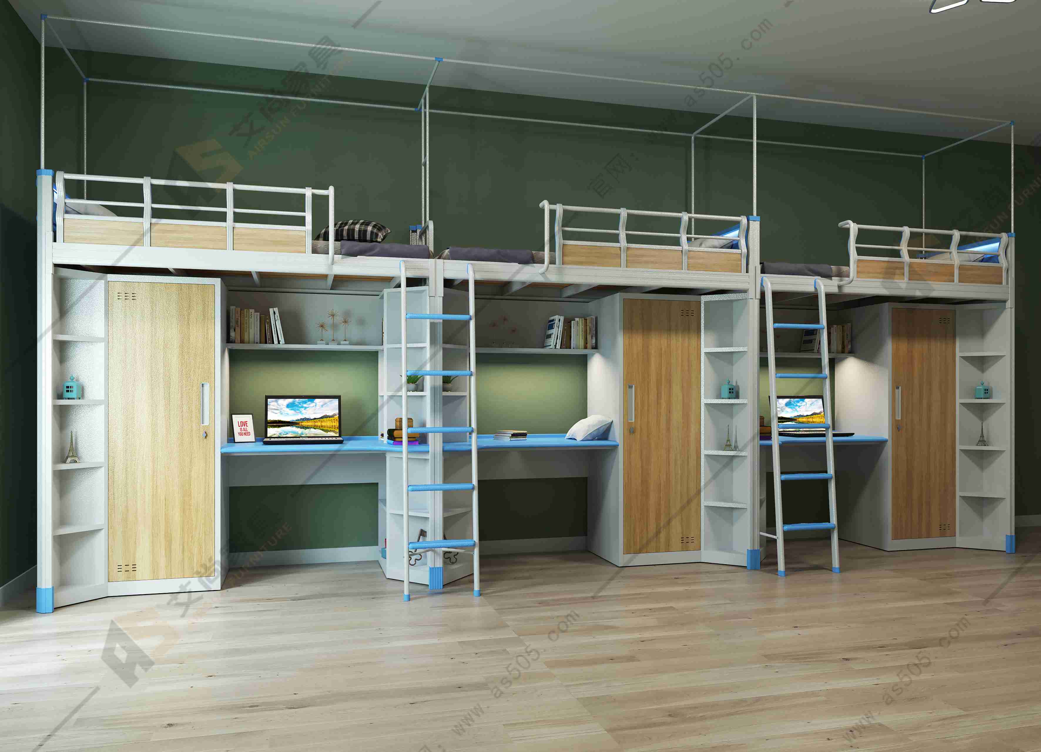 它由床、書柜、衣柜、書桌和梯架組成。書柜和衣柜連接在床架床腿內側,書桌將書柜、衣柜連在一起,床架有書柜的一頭安裝有梯架,床架的另一頭與梯架同側有護欄,上方睡覺,下方辦公+收納,生活和學習分區。由于床是立體空間組合,不僅節省了宿舍的空間,而且使宿舍整齊美觀,又便于學校的管理。