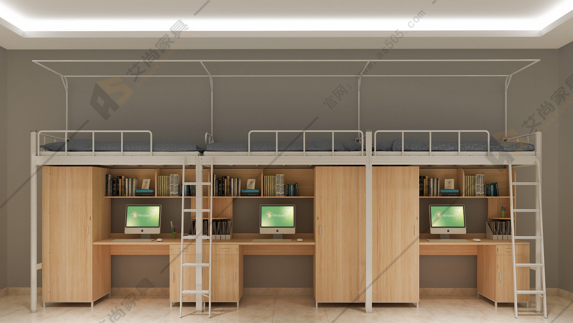 公寓床的書桌和書柜不但滿足了學生日常學習、休閑的生活,而且可以擺放各類書籍 、植物盆栽等物品,衣櫥的分區設計,讓空間利用做到整齊有序。