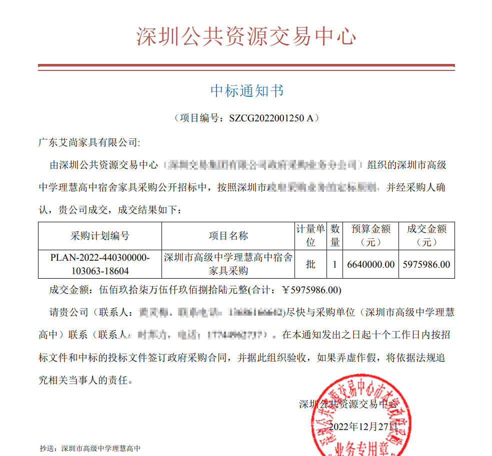 2022年底,廣東艾尚家具憑借優質的產品質量、出色的設計方案以及熟練的工程案例經驗,在眾多競爭對手中脫穎而出,成功中標創新高中、理慧高中宿舍家具采購項目,中標金額共一千多萬。