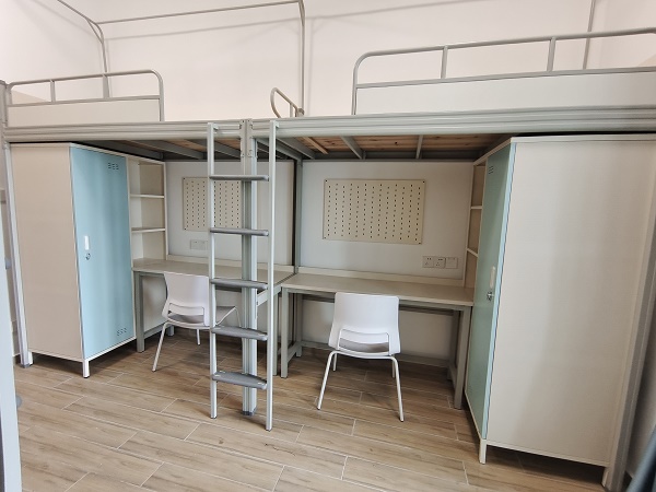 四月,項目安裝現場進入尾聲,各宿舍樓陸續安裝完畢。廣東艾尚家具的生產速度快,車間可日產五百個位,足以可見其生產規模;安裝速度也牛,兩千多個床位在20天左右完美呈現在大家眼前,整齊劃一,光鮮亮麗!