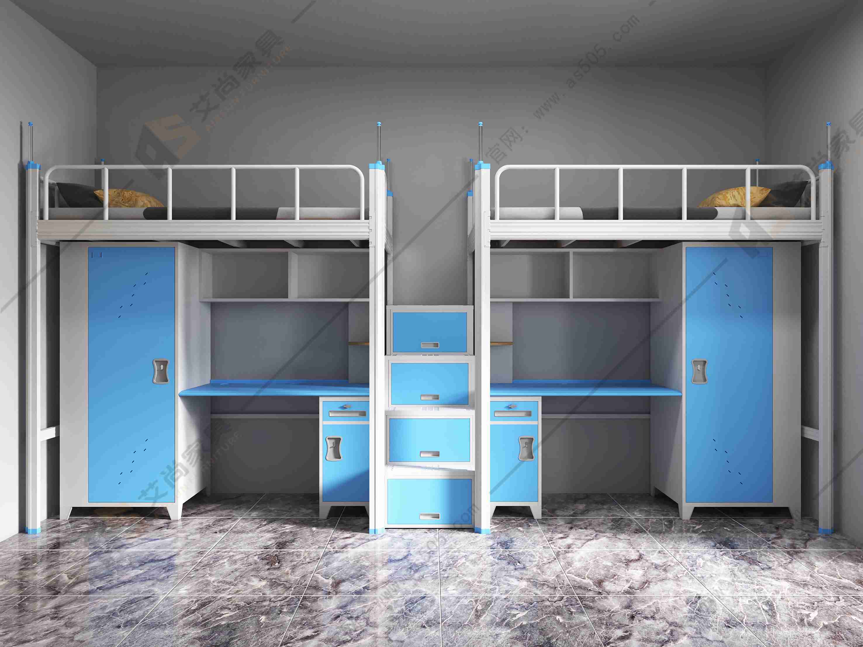 學生公寓床由床、書柜、衣柜、書桌和梯架組成。書柜和衣柜連接在床架床腿內側,書桌將書柜、衣柜連在一起,床架有書柜的一頭安裝有梯架,床架的另一頭與梯架同側有護欄,書桌的桌面下有鍵盤支架和抽屜架。由于床是立體空間組合,使宿舍整齊美觀,便于學校的管理。