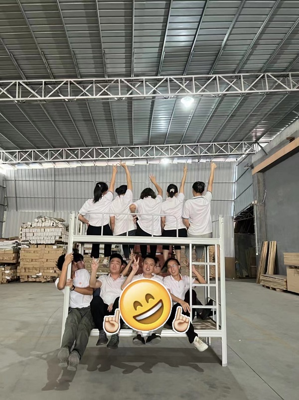 員工宿舍床承重性和穩定性都需過關,那就要選好材料。艾尚采用1.2mm厚度的冷軋鋼板為原材料,床承重達500kg,十個人坐上去也妥妥的(見下圖)。艾尚員工宿舍床采用新款卡扣式結構,重力向下,銜接處越卡越緊,不再用一顆螺絲釘銜接,穩固靜音,經久耐用。