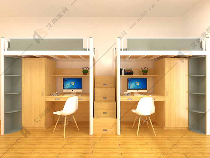 學生公寓床批發廠家,公寓床生產廠家 新設計一間四人宿舍放上兩張二連二人大學學生公寓床一點不擁擠,立體式空間設計,不浪費床下的每一分空間。床下柜搭配衣柜、書柜、書架、電腦桌,現在學生用的家具全都包含在內。就連床梯的空間也高度利用,在梯子下面設計有行李架和鞋柜,可以說你需要用到的我們都考慮到了。