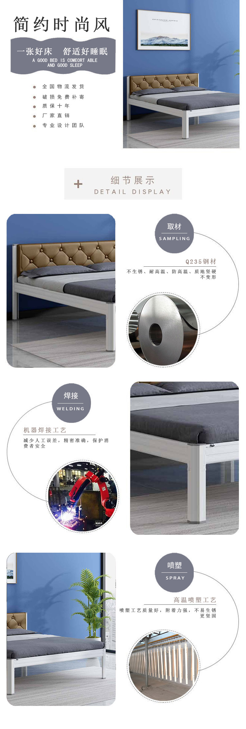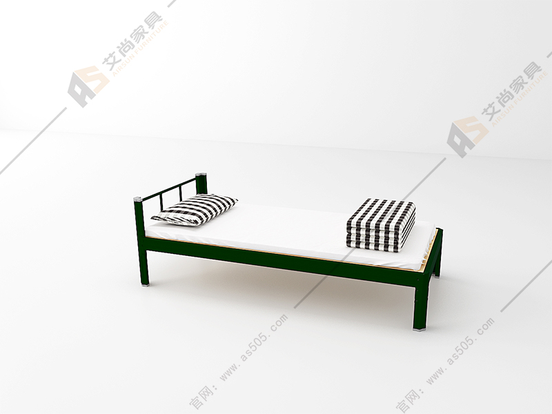 產品介紹: 單人位軍用單層鐵床,產品常規尺寸1980長1200寬800高mm(可按照客戶宿舍需求定制尺寸),產品整體顏色綠色床架(可根據客戶喜好定制顏色),原材料采用優質冷軋鋼板經特制成型線軋制而成,其立面為中空異形,立柱正面和側面有加強筋,材料厚度為1.2mm(國標)床體承重500-1000kg!產品采用 紙箱包裝減少運輸途中受損,產品主要適用于企業、工廠、學校2-6人間宿舍,本產品質保十年!