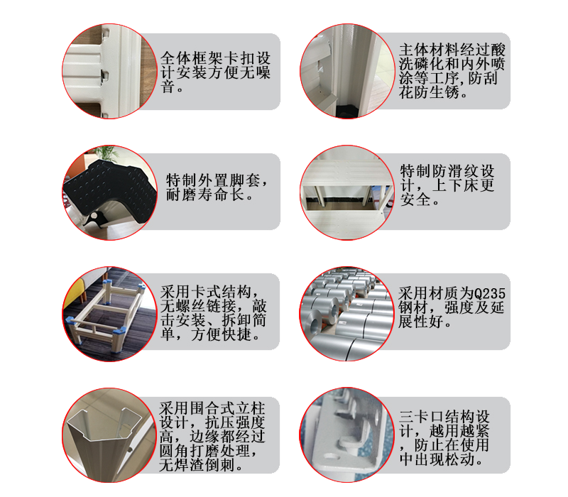 雙層鐵床表面全自動噴粉處理,0甲醛;中空異型結構,卡扣式連接、無螺絲;100%冷軋鋼板不參假。真正的良心企業!