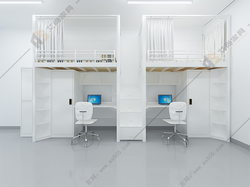 產品介紹: 兩連體中梯雙人位學生高低床,產品常規尺寸4480長900寬2100高mm(可按照客戶宿舍需求定制尺寸),產品整體顏色:白床架搭配白柜子(可根據客戶喜好定制顏色),床架:原材料采用優質冷軋鋼板經特制成型線軋制而成,材料厚度為1.2mm(國標)床體承重500-1000kg!產品采用紙箱包裝減少運輸途中受損,產品主要適用于企業、工廠、學校4人間宿舍,本產品質保十年!