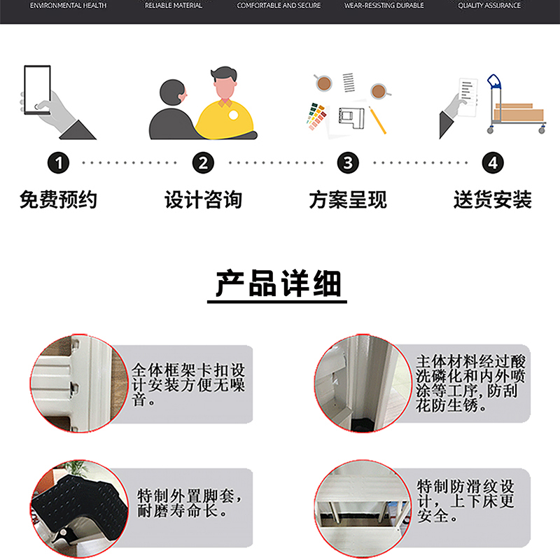 產品介紹: 艾尚家具溫州上下鋪鐵床外觀上高端大氣,并且安全舒適。溫州上下鋪鐵床采用環保0甲醛烤漆,無論悶熱潮濕都恍然如新。 做工設計上,溫州上下鋪鐵床采用卡口式連接,這種連接的優點在于承重性強,穩固性好,上床時非常平穩,不易搖晃,安全舒適,可以適應各種宿舍。