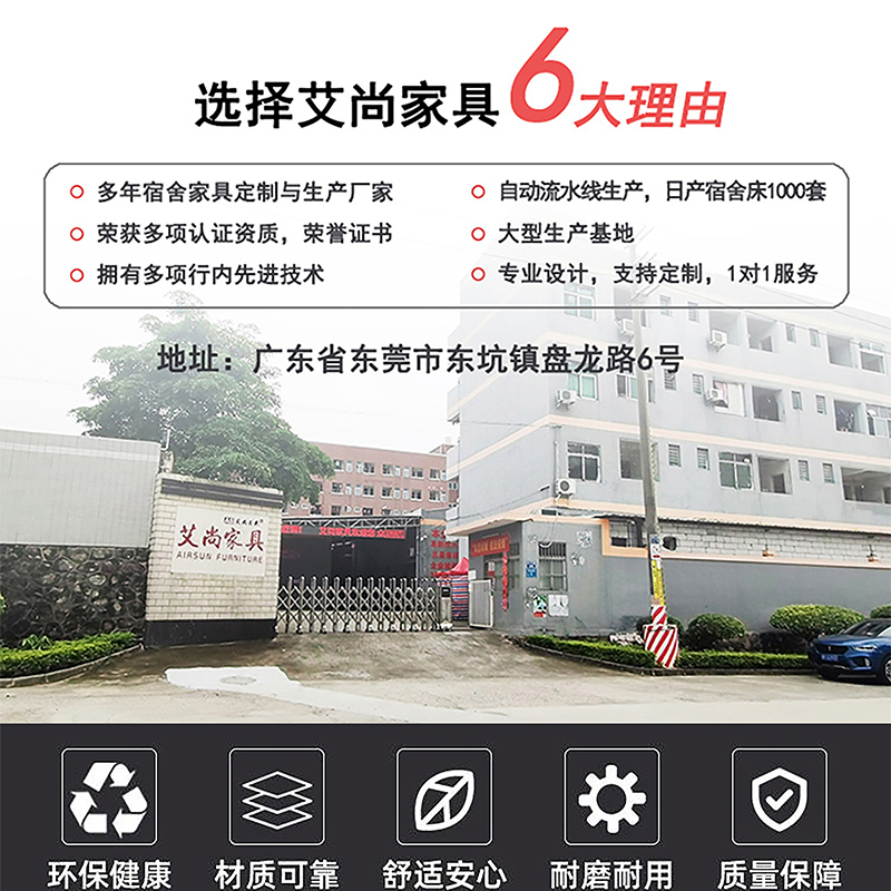 產(chǎn)品介紹: 艾尚家具宿舍床公寓床外觀上高端大氣,并且安全舒適。宿舍床公寓床采用環(huán)保0甲醛烤漆,無論悶熱潮濕都恍然如新。 做工設(shè)計(jì)上,宿舍床公寓床采用卡口式連接,這種連接的優(yōu)點(diǎn)在于承重性強(qiáng),穩(wěn)固性好,上床時(shí)非常平穩(wěn),不易搖晃,安全舒適,可以適應(yīng)各種宿舍。